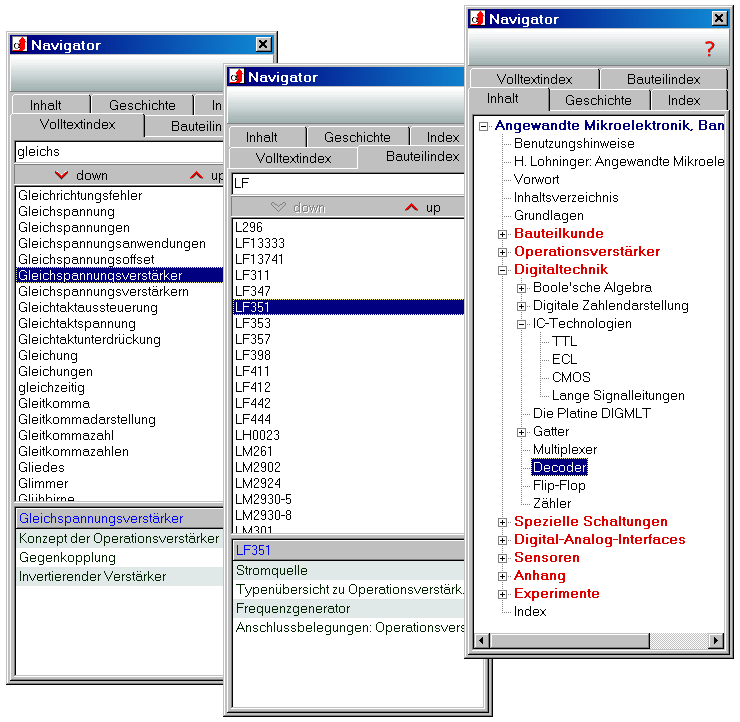 Several configurable levels of the pixLibris navigator give access to the digitized book. The examples below are (from left to right) the full text index, the component index and the contents page of the pixLibris book "Angewandte Mikroelektronik" by H. Lohninger. The full text index contains all words of the digital book and lists the relevant pages.